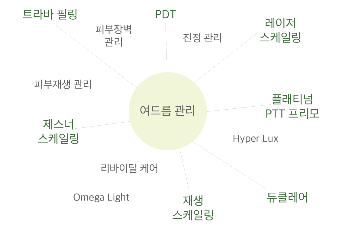 특히, 각종 레이저 시술의 전후 진행 시 레이저 치료의 효과를 증대시키는 데 중요한 역할을 하며, 꾸준한 메디컬 스킨케어는 피부 스스로의 힘을 키워 피부를 건강하게 만들어 줍니다.